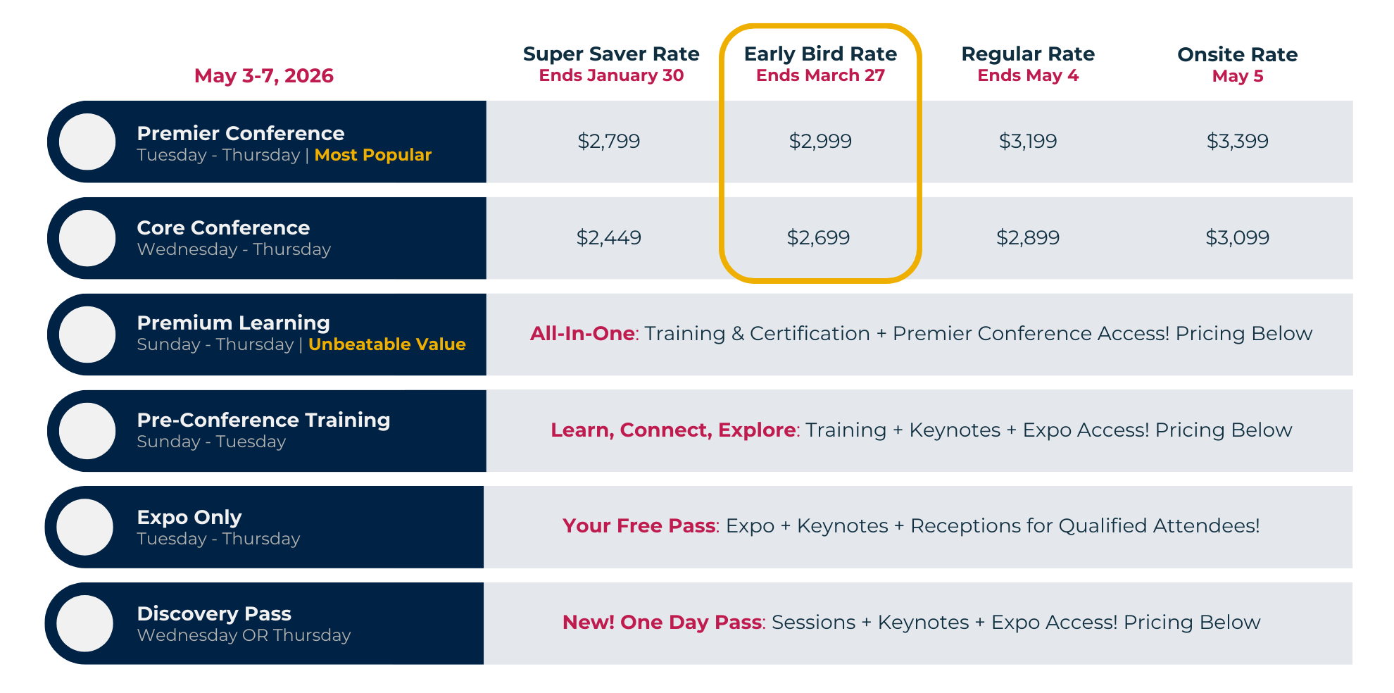 Choose a pass that fits your goals, schedule, and budget to optimize your conference experience. Options include Pre-Conference Training, one-day workshops, networking events, and informative sessions—all designed for your professional development. Every pass includes Expo Hall access, featuring receptions and networking, and access to our keynote presentations.