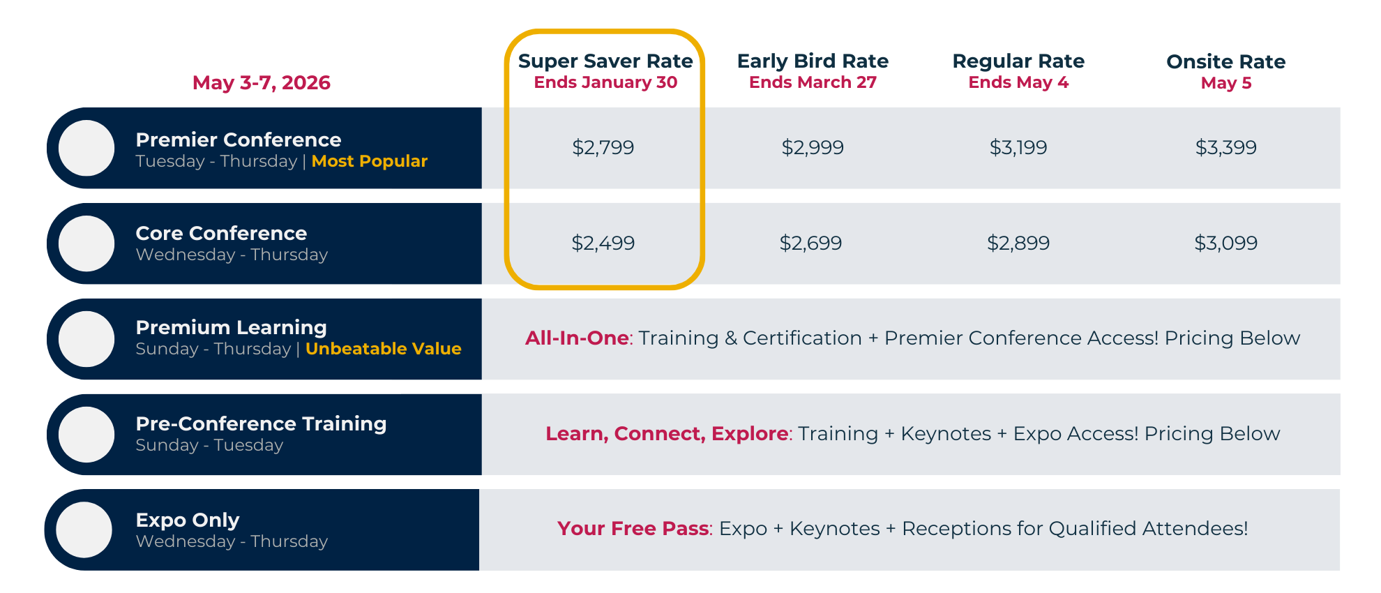 Maximize your conference experience! Gain valuable training, earn certifications, and be inspired by impactful keynotes. Explore the expo, connect with industry leaders, and enjoy exclusive perks that make this event a must-attend.
