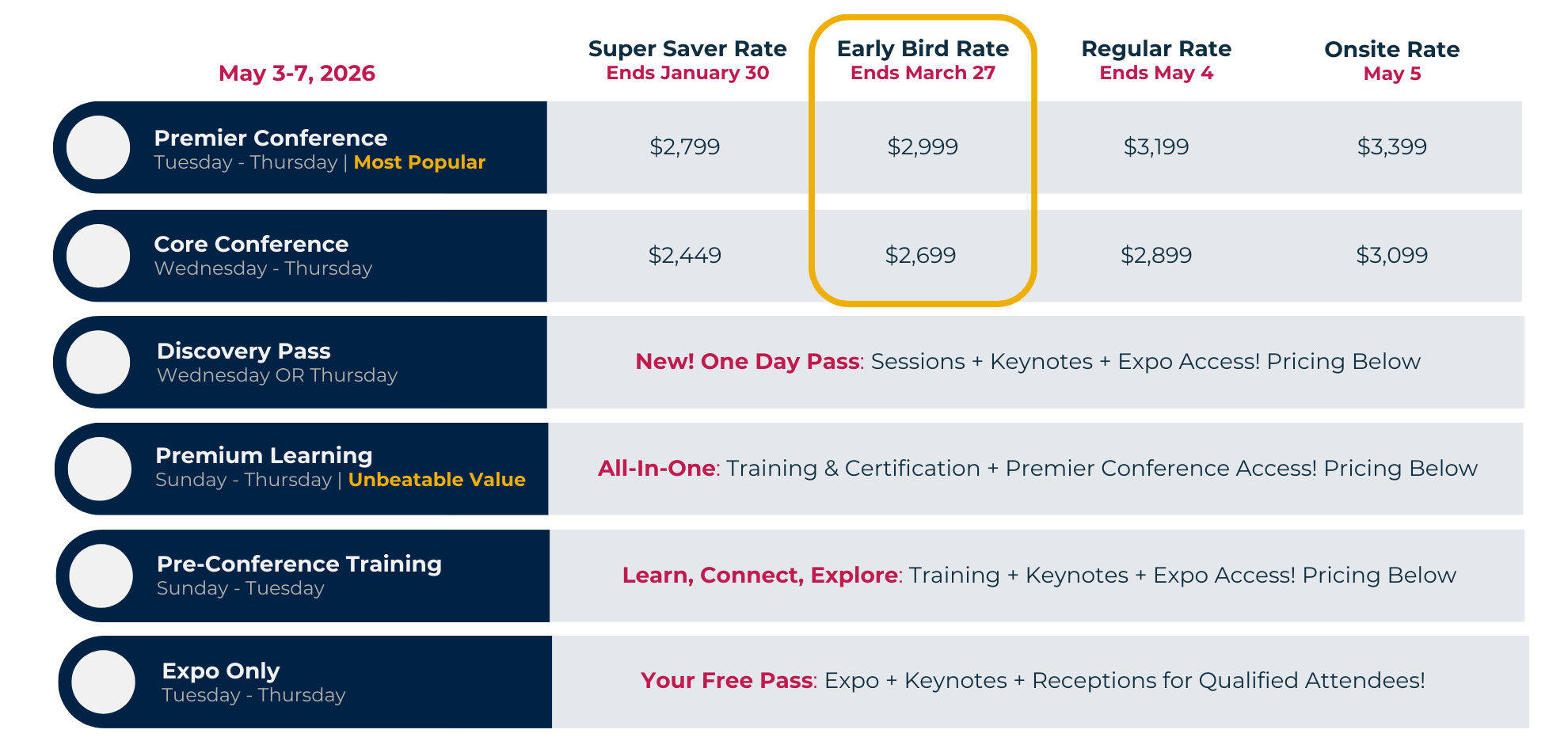 Choose a pass that fits your goals, schedule, and budget to optimize your conference experience. Options include Pre-Conference Training, one-day workshops, networking events, and informative sessions—all designed for your professional development. Every pass includes Expo Hall access, featuring receptions and networking, and access to our keynote presentations.